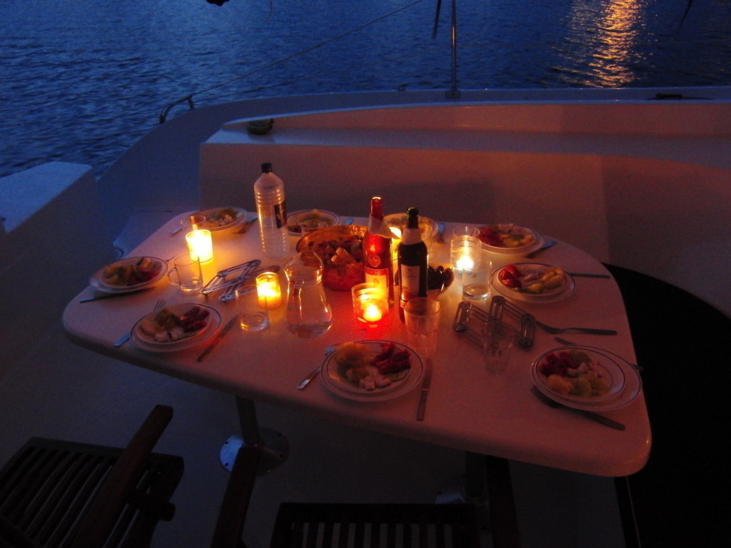 Am Abend unter den Sternen auf dem Achterdeck, bei einem Gläschen Rotwein nach dem Dinner, der Mond spiegelt sich im Wasser. Der Duft von Salbei und Basilikum weht von der Insel herüber.